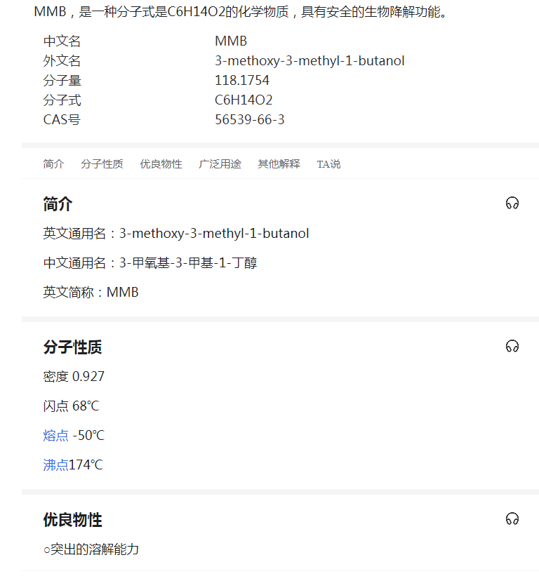 3-甲基-3-甲氧基-1-丁醇,日用香精溶劑,簡寫為MMB。它是一種無色、透明,略帶清涼感醚樣氣息的液體。MMB具有突出的溶解能力,MMB的分子中同時擁有羥基和甲氧基,這使它在分子內和分子間形成很強的氫鍵,并顯示出兩親性,即MMB既溶于水(極性溶劑)又溶于油(非極性溶劑)。且MMB-水體系在0℃和沸點之間沒有相態分離。其次,MMB-水體系形成簇狀結構,也就是作用力很強的氫鍵,這個特性表現為適中的黏度,并且其最高黏度出現在MMB與水的比例為80:20 時。MMB在毒物學測試的許多方面顯示出很高的安全性,其生物降解能力也較強,并伴有低易燃性、無臭氧消耗等特點,揮發后沒有殘渣。這些優勢使MMB擁有廣泛的用途。